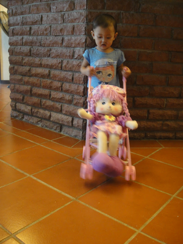 And as i was bz-ing myself with things at home, adik decided to play all grown up, taking Betty for a stroll.. Yes, around the house.. :P Thanks Achik, for Betty.. She loves her! :)